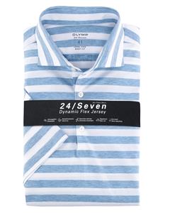 OLYMP 24/Seven Level Overhemd KM combineert stijl met comfort. Dit blauw gestreepte overhemd met lange mouwen en widespred boord is gemaakt van 92% katoen en 8% elastaan, wat zorgt voor een flexibele pasvorm. OLYMP staat bekend om zijn hoogwaardige kleding, ideaal voor elke gelegenheid.